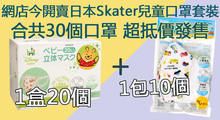 Pretties.com.hk 表示,將發售Skater 兒童口罩1盒(20個) (1-3歲適用)+1包(10個)(4歲以上適用) ,套裝以$113超抵價發售,款式則隨機發貨,店主指這批是最後一批兒童口罩。