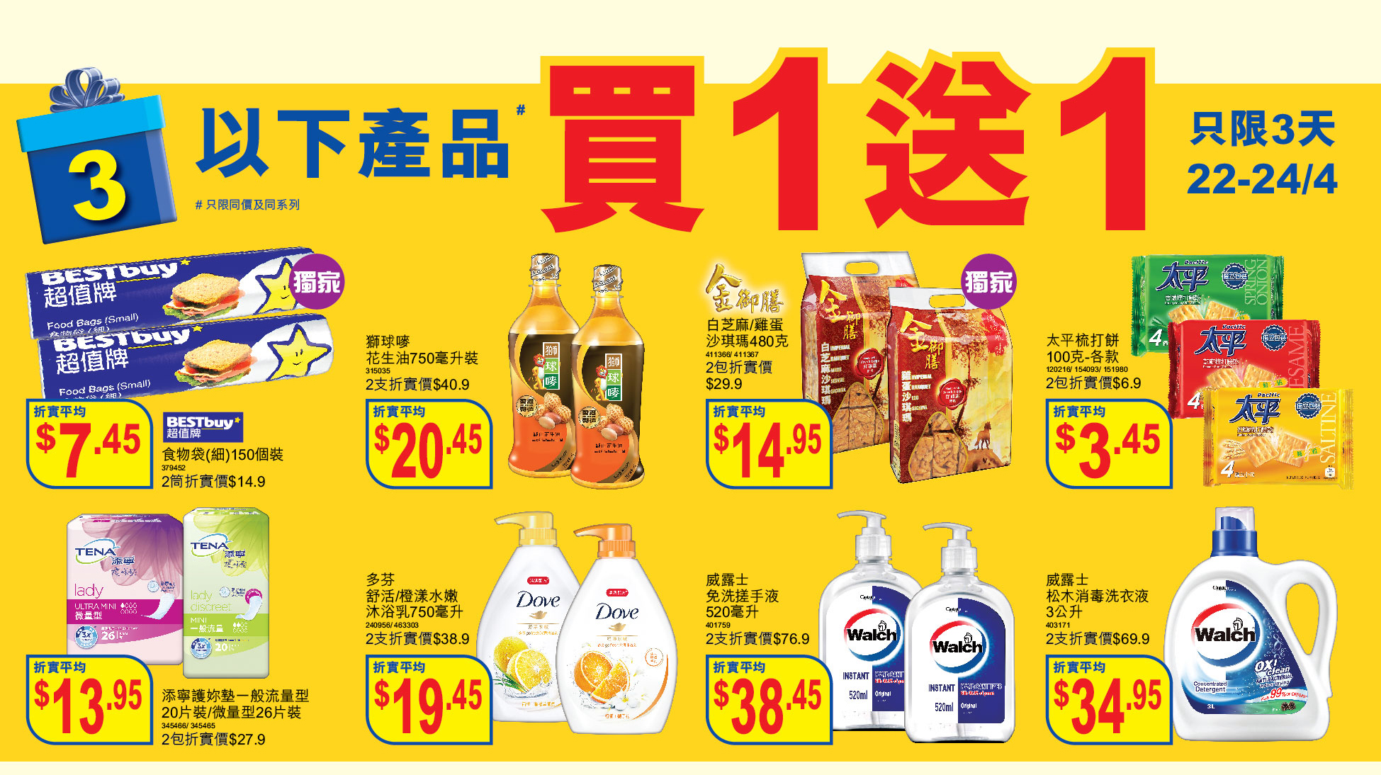 。每周三天精選產品買一送一(優惠期:22至24/4)百佳再度為老友記悉心挑選8款常用食品、日用品及抗疫產品,於本周三至五一連3天,老友記憑「長者咭」於百佳購買同價同系列之指定產品,即可享用買一送 一優惠。
