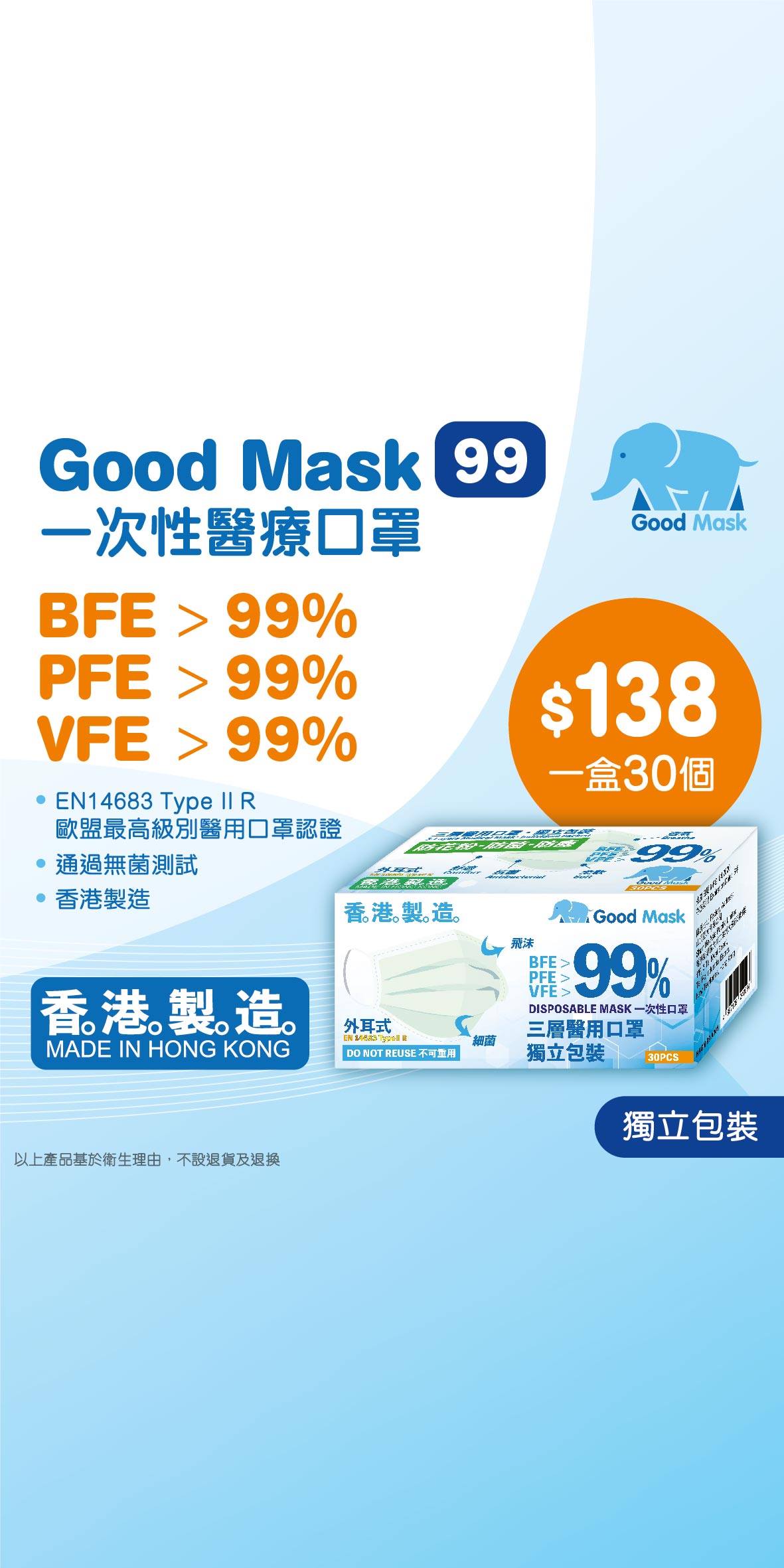【口罩規格:Good Mask 99 一次性醫療口罩】