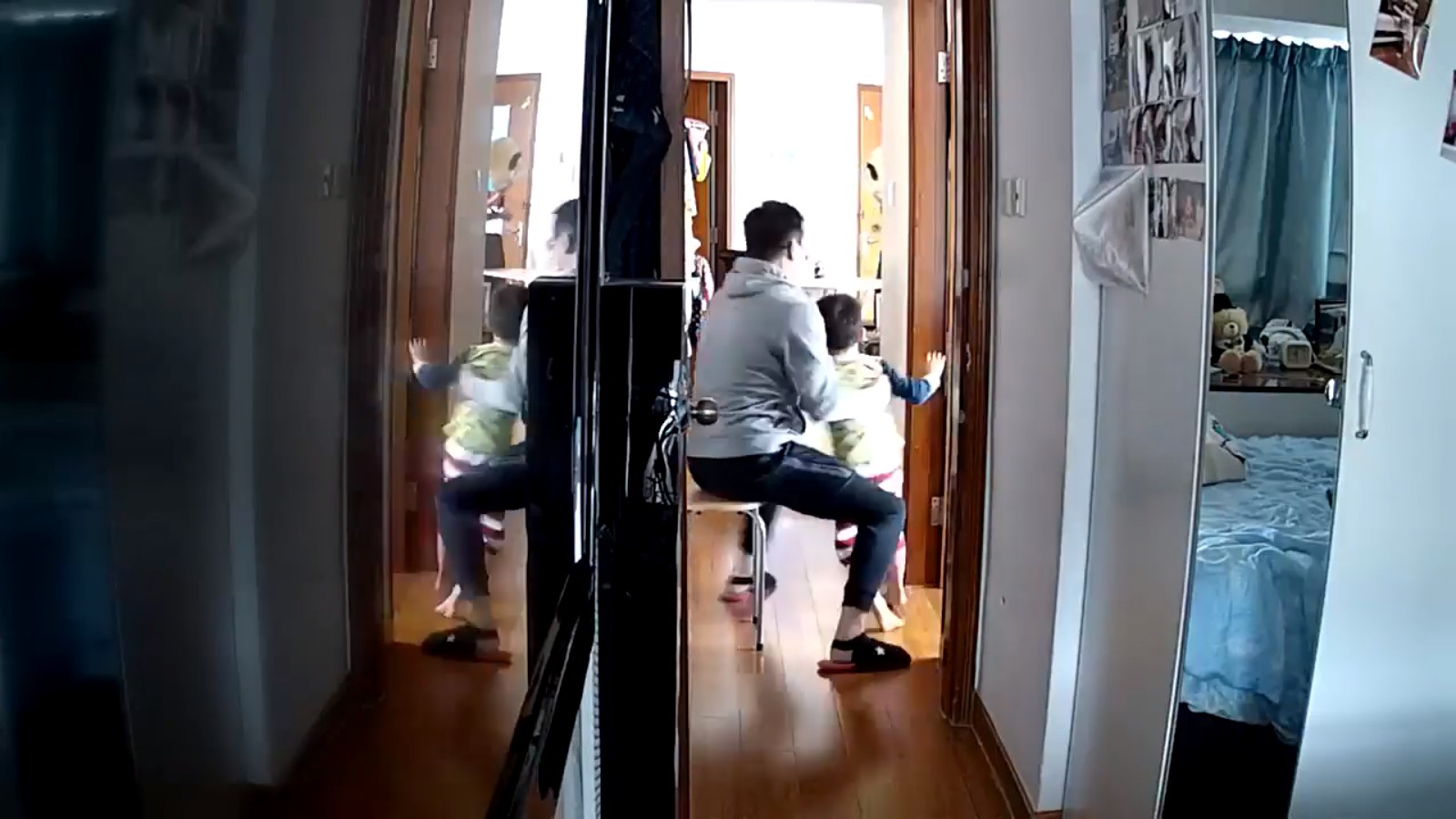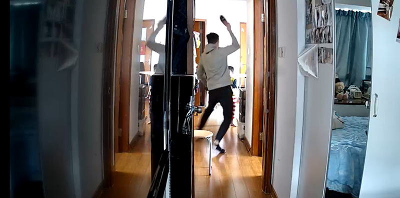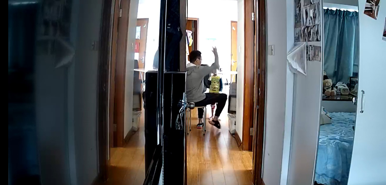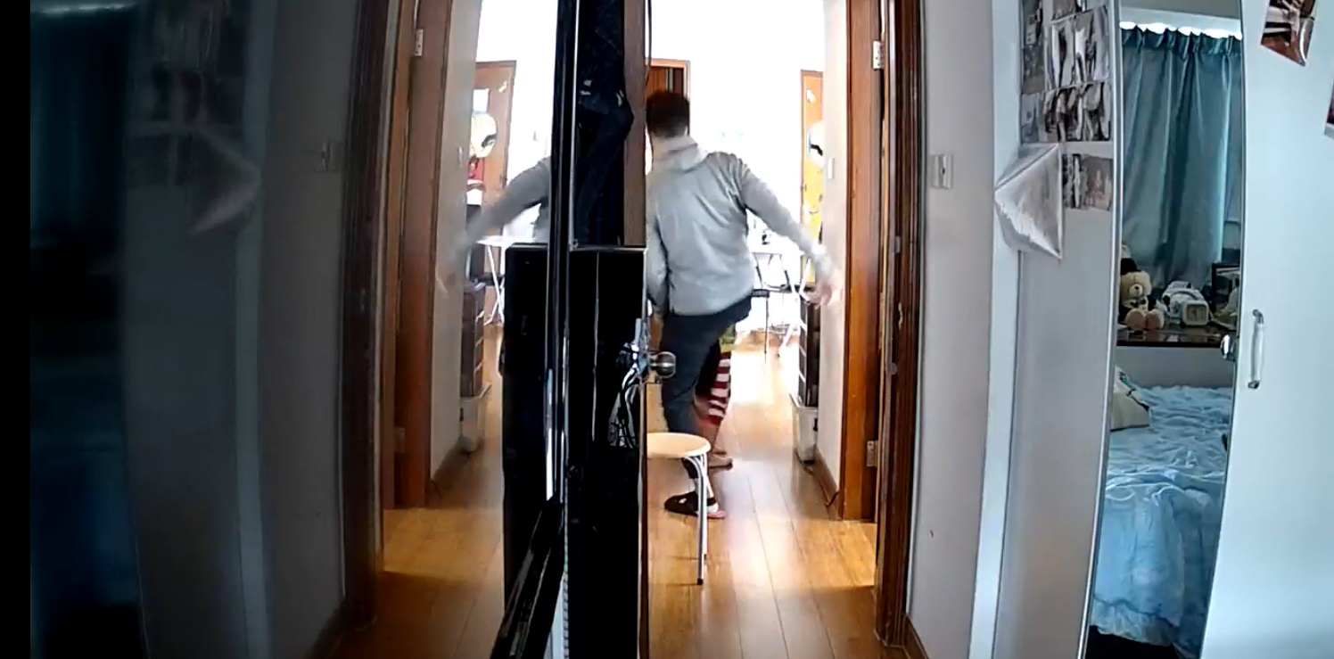 男子穿回拖鞋,粗暴地拉兒子離開房間,在走廊連續踢他兩腳,並再次脫掉拖鞋丟向他,繼續罵他「搞到爸爸媽媽成日鬧交」、「對工人姐姐無禮貌」、「在學校打架」、「唔識教好妹妹」等,又稱「我就來唔喺度住,你哋死埋一堆」、「你去做狗啦不如,汪汪汪」等,其後更推跌兒子身旁一個儲物櫃,兒子繼續痛哭。男子打罵兒子期間,屋內傭人一直在工作,未有理會或勸阻。