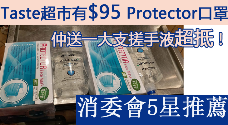 網民最近在Facebook群組爆料,約下午3點半在屯門市廣場 Taste 超市分店 ,正在發售 Protector 成人口罩30片,更送搓手液1枝,一套套裝只售$95。
