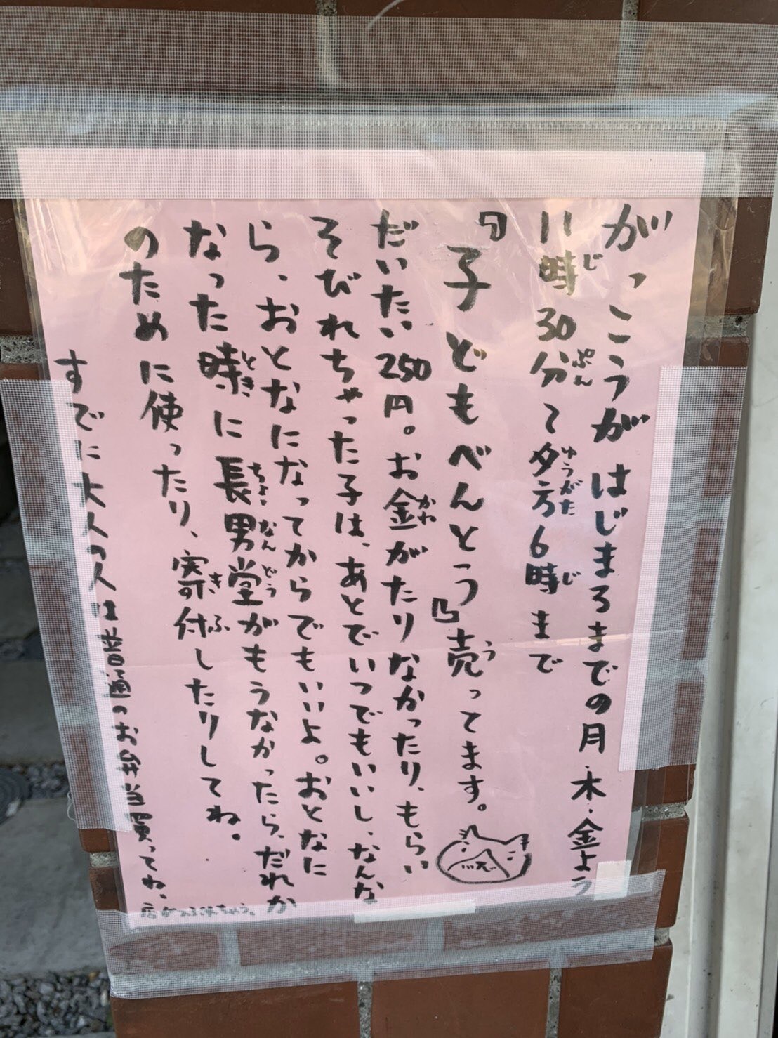 網民上傳的粉色公告可見,直至學校復課前,便當店長男堂會在每周一、四、五早上11時30分至晚上6時,售賣250日元(約18港元)的兒童便當。老闆更親筆寫下「錢不夠或沒拿到零用錢的孩子,晚點再付或等到長大後再付也可以」。