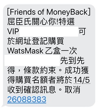 該網民上載SMS截圖,SMS指只需要按下連結進入網頁登記,即可以搶先一步訂購屈臣氏 WatsMask 口罩,結會在5月14日公布。