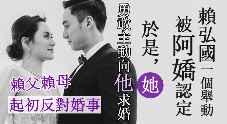 而談及求婚過程,阿嬌坦言是自己主動求婚,問對方「要不要結婚」,但自己並非是突然要求,而是某次他們一起到外國旅遊時,她非常想嘗試跳傘,不過高度太高,讓她有些猶豫及害怕,結果一旁有懼高症的賴弘國卻自告奮勇,表示「我陪你一起跳」,令她覺得很浪漫,也因此認定對方是想牽手走一輩子的人。