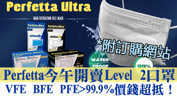 Perfetta HK於今天 5 月12日下午2時,發售9000盒 Perfetta ASTM Level 2 Moderate (PFE/BFE/VFE>99.9%) 口罩,詳情如下: