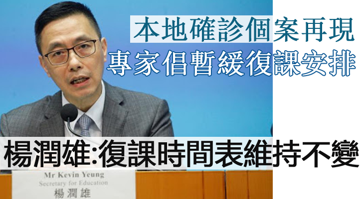 教育局長楊潤雄表示,留意到本港再有本地感染個案,會等衛生防護中心跟進及追蹤個案,再考慮是否足以影響復課安排,目前分階段復課時間表暫維持不變。