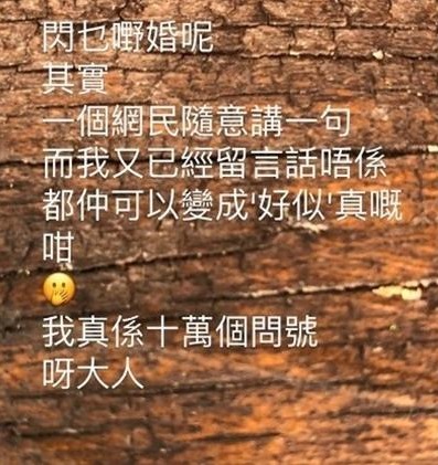 「閃乜嘢婚呢?其實一個網民隨意講一句,而我又已經留言話唔係,都仲可以變成『好似』真嘅咁,我真係十萬個問號呀大人。」