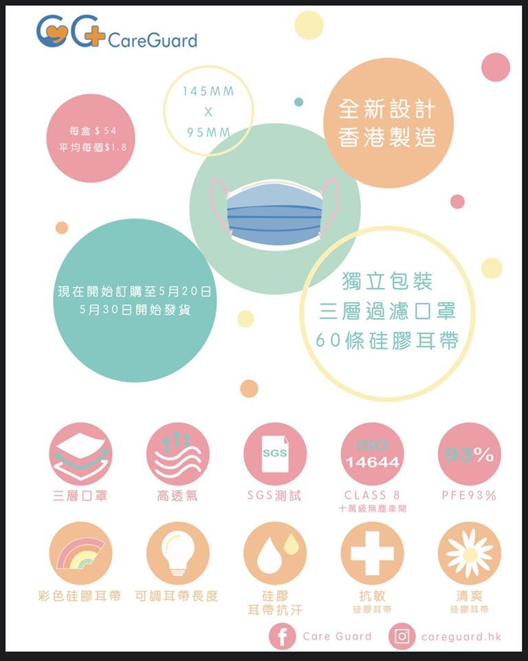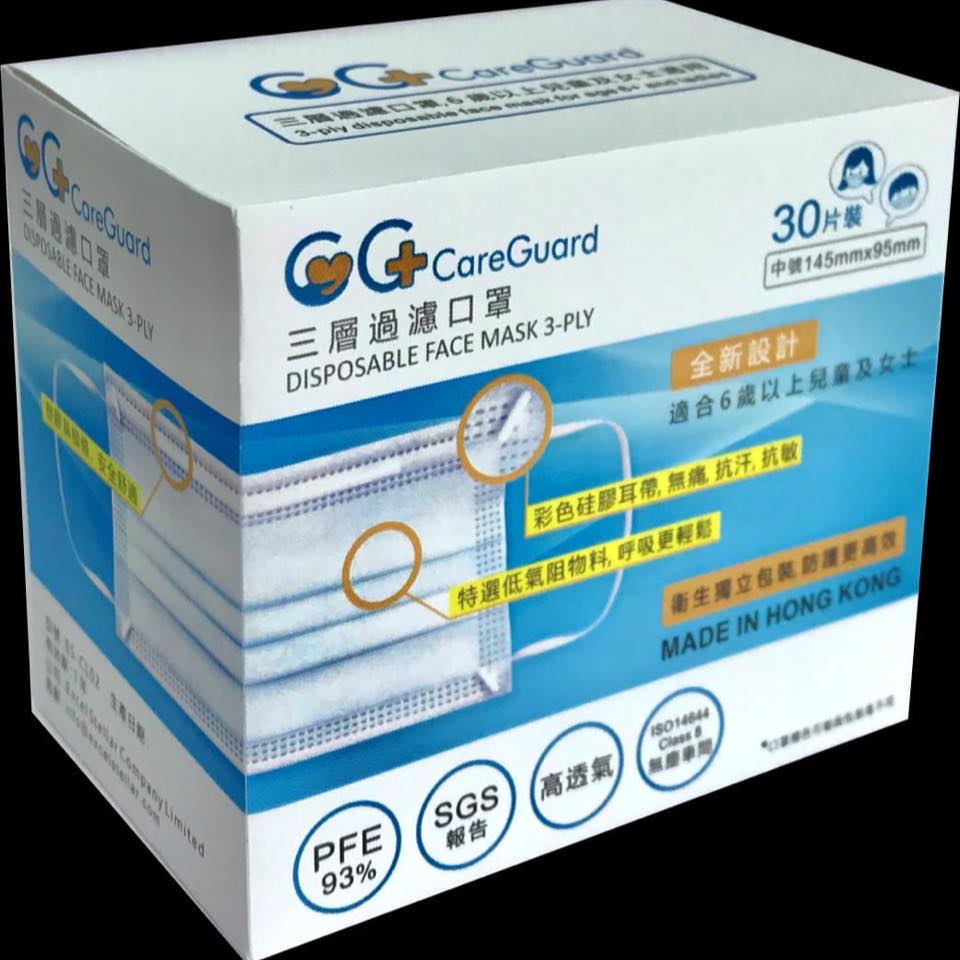 卓焺有限公司即時開賣CareGuard兒童口罩,每盒30個獨立包裝口罩,售$54,即平均每個售$1.8,價錢相宜,並將於5月30日開始發貨。