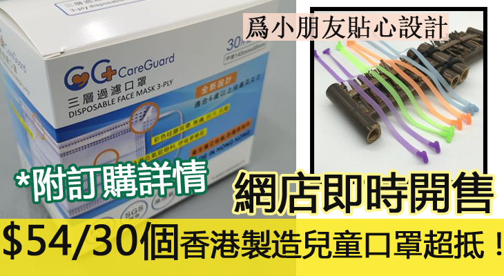 卓焺有限公司即時開賣CareGuard兒童口罩,每盒30個獨立包裝口罩,售$54,即平均每個售$1.8,價錢相宜,並將於5月30日開始發貨。
