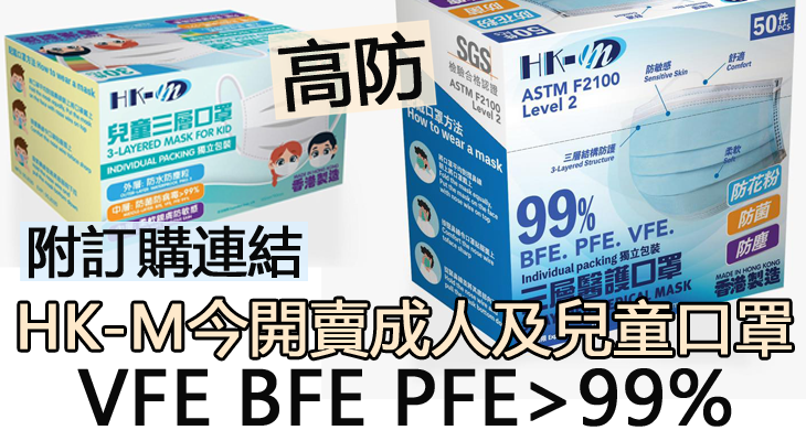 【附訂購連結】HK-M今開賣成人及兒童口罩 VFE BFE PFE>99%