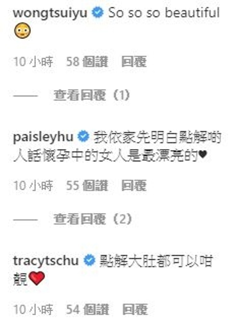 懷孕的女人最美,她的大肚照立即引來不少圈中好友包括朱千雪、黃翠如、黃智雯、陳敏之、胡蓓蔚等紛紛留言讚她是靚媽媽。好友朱千雪寫道:「點解大肚都可以咁靚?」