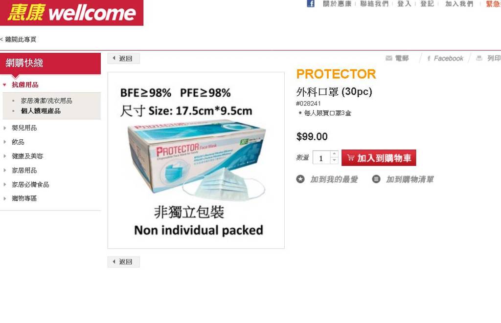 惠康網店秘密開售$99/30個一盒Protector口罩