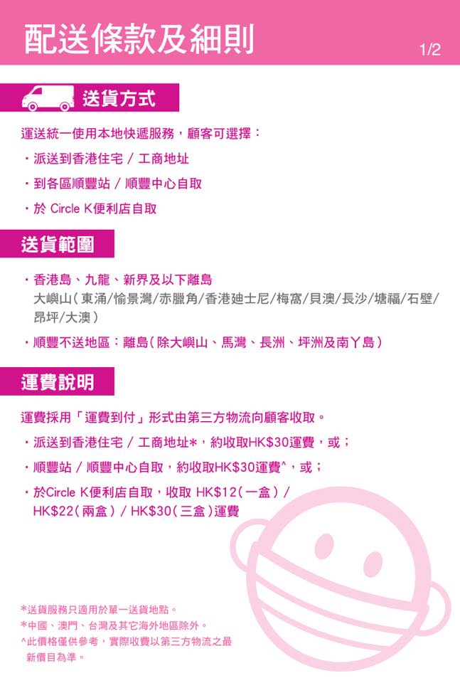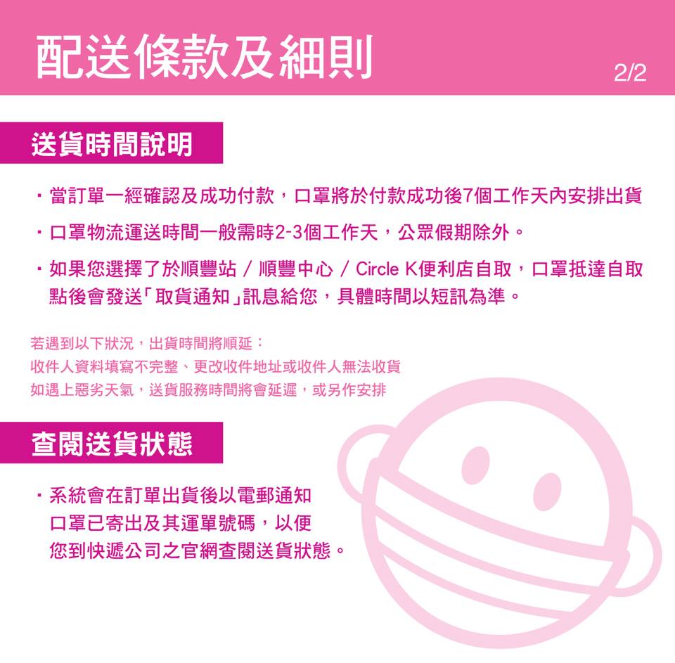 由於這次的是發售現貨,所以大家付款購買後七個工作天就可以收到口罩。買家可以選擇順豐到付、智能櫃自取及 Circle K 自取。請看以下送貨細則:
