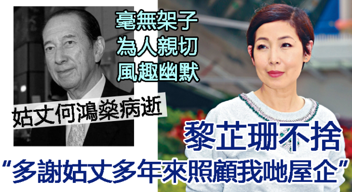 對於姑丈何鴻燊病逝,黎芷珊大感難過:「雖然有心理準備,但非常之不捨得,好想多謝他,多年來對我哋屋企一直好照顧,尤其是我18歲時爸爸走咗之後,他好照顧我媽咪及屋企,當年我細佬(黎烈)結婚時,他好有心專登來恭喜我細佬,一個大忙人也抽時間到一到,如此有心好難得。」