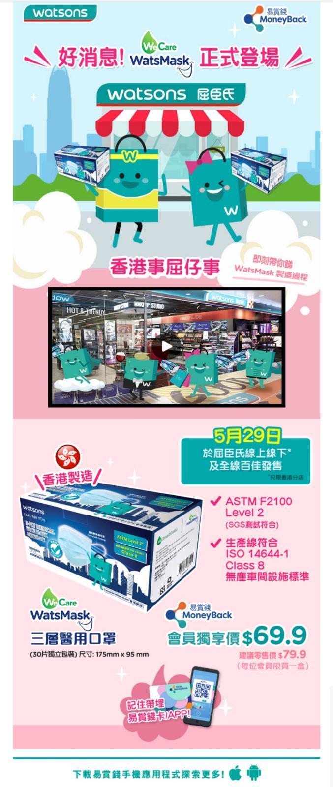 繼特選易賞錢會員優先購買後,屈臣氏自家口罩品牌「WatsMask WeCare」明天於屈臣氏線上、香港門市及全線百佳發售。
