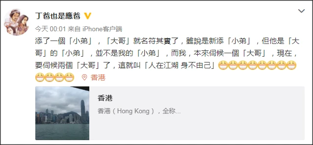 發文中出現了很多次「大哥」和「小弟」,不用多說吧,應采兒二胎誕下的是B仔。不知道她會否再追個小公主,不過生第三胎肯定是高齡懷孕,比較危險,大家覺得呢?
