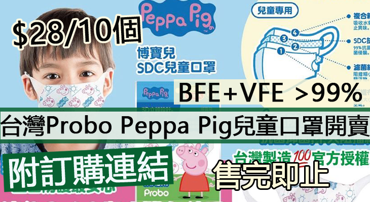 網店MISS Mammy即時提供Probo Peppa Pig 兒童口罩開售,為台灣製造,官方授權正品。