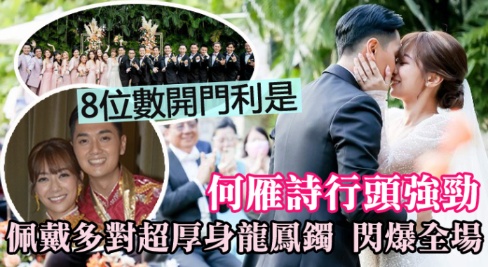 着龍鳳裙褂的新娘子行頭強勁,除頸上有大串金鏈外,還有分量十足的金豬鏈,雙手佩戴多對超厚身的龍鳳鐲,還有數對金戒指及鑽戒,陽光下全身金光閃閃,阿詩所戴的3隻鑽戒,左手無名指是訂婚戒指,但她表示已忘了訂婚戒有幾多卡,而新人應傳媒要求下甜蜜咀嘴,閃爆全場。
