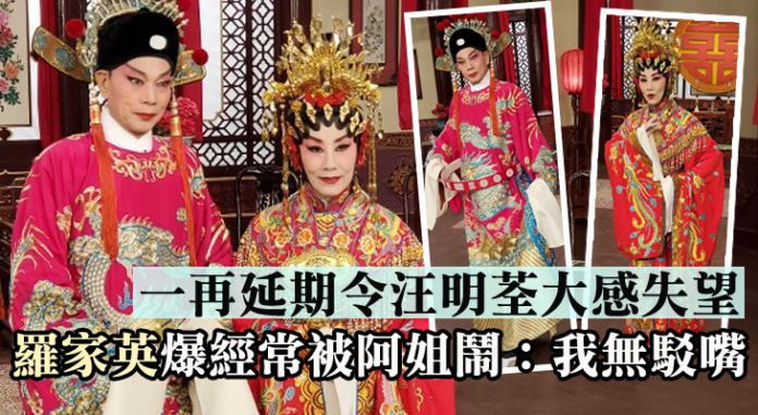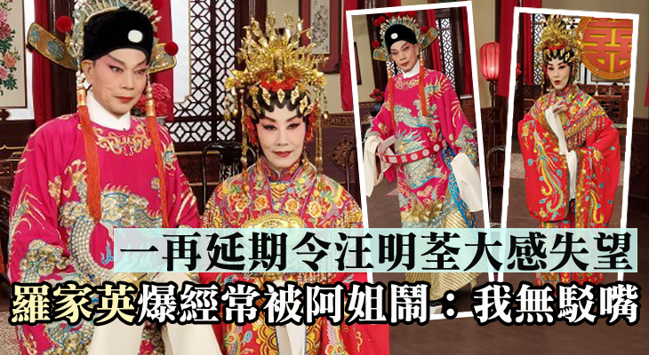 汪明荃(阿姐)和羅家英昨晚夫妻檔為《歡樂滿東華》錄影,演出由已故粵劇名伶紅線女傳授給阿姐的首本劇目《宮主刁蠻駙馬驕》。