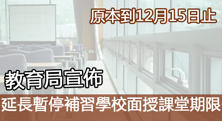 教育局今天決定再延長暫停至12月23日止。教育局表示,在暫停面授課堂期間,學校應暫停校內活動,並讓家長知悉有關安排,包括補堂或退款機制等事宜,同時,學校應保持校園環境清潔衞生。
