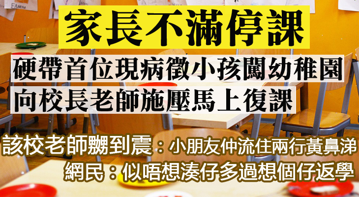 有幼稚園老師在社交網專頁「生仔要考牌系列」投稿,指有一名家長在全港停課後,經常打電話到學校追問「返得學未?」,隔日便帶其「流住兩行黃鼻涕」的小孩硬闖學校,有時又讓不懂中文的外傭姐姐帶小孩回校,亦不肯接聽電話。更令老師們生氣的是,該名家長更慫恿其他數名家長,用群眾壓力企圖逼使校長復課。