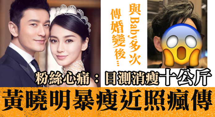 再度有婚變傳聞後,黃曉明近日上載一輯新照片,看來消瘦不少,鬍子都剃得乾乾淨淨,臉部光滑,彷彿年輕了很多。可是他的表情欠奉,沒什麽笑容,與他平時親民的形象有蠻大的差別……因而很多網民懷疑他暴瘦是否與Baby的婚變有關,目測暴瘦了近10公斤。