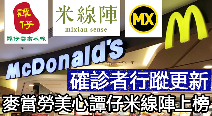 衛生署更新確診患者的潛伏期最新行蹤,多11家食肆上榜,包括兩間麥當勞和兩間譚仔雲南米線,另有美心MX、羅麥記和米線陣等。
