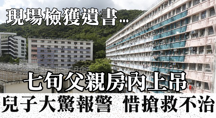 事件發生在香港仔漁光邨靜海樓,今早9時10分,警方接獲一名23歲男子報警,指其75歲姓鄭父親在上址一單位睡房內,以尼龍繩上吊,警員及救護員到場,將已陷昏迷的老翁解下,送往瑪麗醫院,惜最終搶救無效死亡。