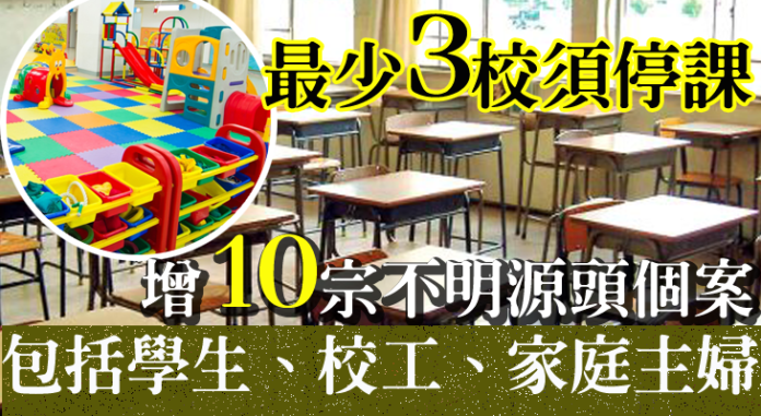 本港今日新增24宗確診個案,包括10宗源頭不明的本地個案。源頭不明個案中,患者的職業涉及學生、家庭主婦、地盤工人及九龍真光中學校工等,據知最少有3間學校需要停課及檢測。