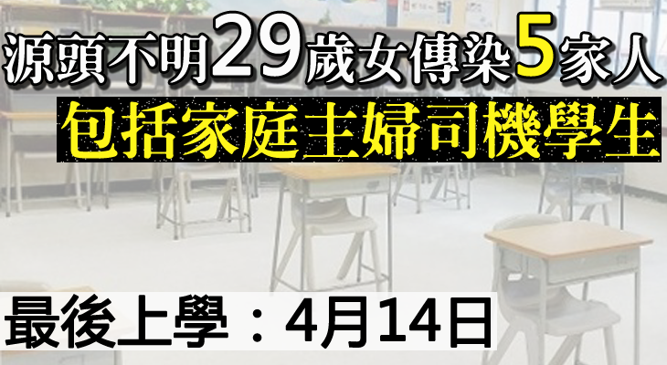 確診女子的表親為一名14歲的中三學生,於洪水橋天主教崇德英文書院就讀,她於4月11日開始咳嗽,4月14日曾回校考試。曾與該名學生處於同一禮堂的學生約有100名。王智康表示,初步理解染疫學生有佩戴口罩,期間沒有飲食,亦沒有於小息時與同學玩。若她最後證實確診,學校會納入強制檢測名單。