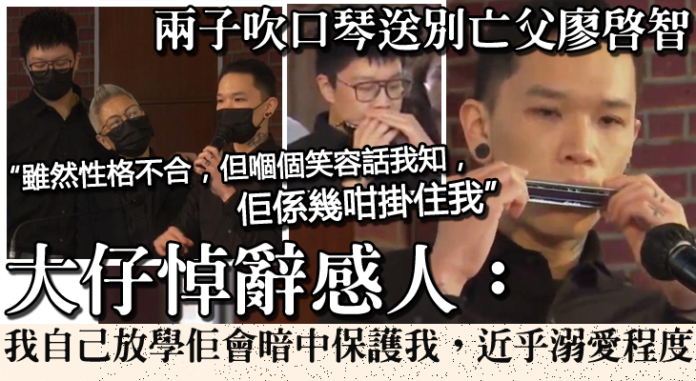 廖啟智(智叔)的大仔廖文哲和二仔廖文信,在安息禮上吹口琴送別父親。