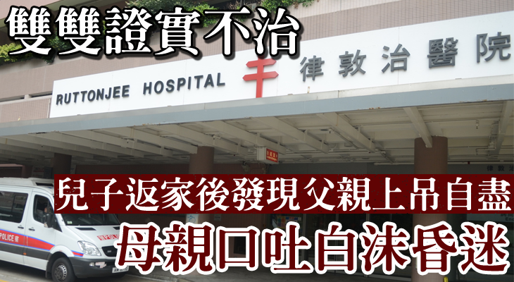 消息指,兒子回到住所後,發現父親用繩索上吊自殺,他將父親解下後,再發現母親倒臥在床上昏迷不醒,口吐白沫,兒子隨即報警求助,將2人送往律敦治醫院搶救,惟最終證實不治。