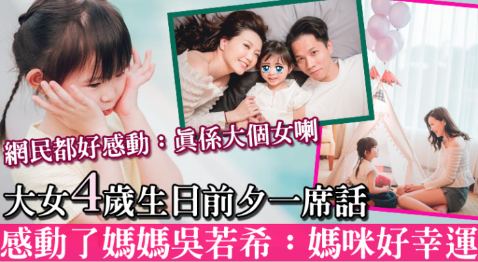 「今天是你四歲的大日子,你呱呱落地的樣子我還很清晰記得,一眨眼,你已經變成了一個小姑娘,這位小姑娘,請你繼續用你的笑容面對一切的挑戰。只想你記得,尋找快樂的真理。所謂理想,隨你所想創傳奇。我會繼續在你背後守護你,我愛你Giselle!也謝謝各位對小女的愛戴﹗」
