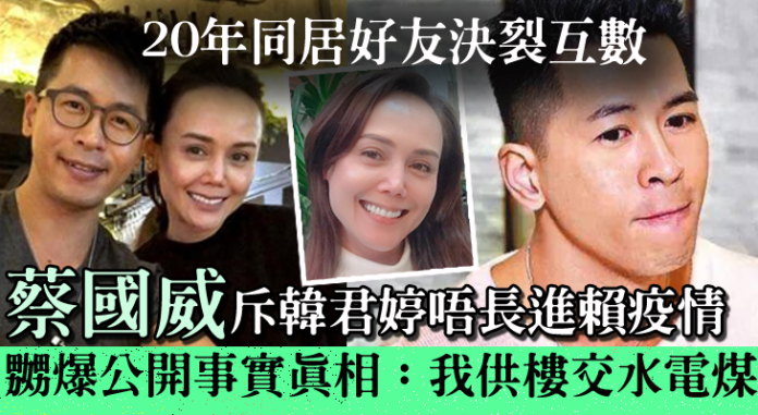 曾是同居好友的蔡國威和前亞姐冠軍韓君婷爆反目,韓君婷自爆被逼遷,又指兩人「同居」時,自己不是白食白住,她有給4位數字金額家用,亦有分擔家務,韓君婷亦取消關注蔡國威社交網,同時又刪掉2人合照,20多年友情一刀兩斷。