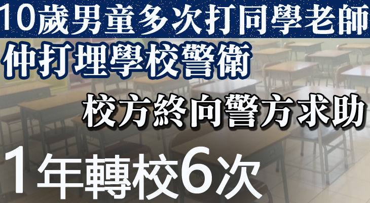 近日一名10歲男童,一年轉校6次,傳由同學打到老師,是名副其實的一名小霸王,今次連學校警衛亦遭殃,校方終向警方求助。