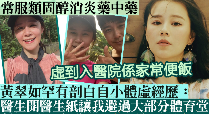 藝人黃翠如是電視台花旦之一,做演藝的人身體最重要,但翠如透露從小已經是一個藥煲,自小體弱多病,很少參與運動。