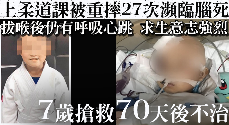 一名7歲男童今年4月21日在柔道訓練時,遭69歲何姓教練及就讀小四的師兄重摔27次,致頭部重創一直昏迷,當場昏迷後送院,留醫70天直至昨晚9時許離世。