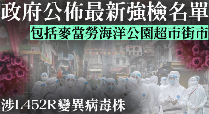 因應一宗涉及L452R變異病毒株的非本地確診個案,有一個指明地方被納入昨日的強制檢測公告。另外,因應早前涉及L452R變異病毒株而與輸入個案有流行病學關連的個案,於指定期間曾身處6個指明地方的人士需要再次進行檢測。為謹慎起見,曾逗留該7個指明地方的人士,即使已完成2019冠狀病毒病疫苗接種,亦須接受強制檢測。