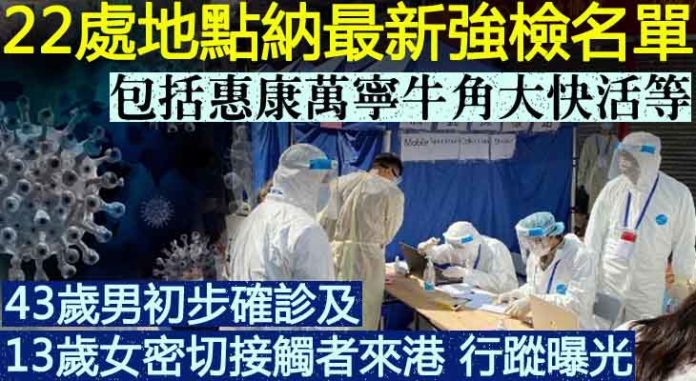 因應本港新增1宗或屬復陽的43歲地盤男工初步確診個案,及澳門確診患者的一名13歲少女密切接觸者已於8月2日來港,食物及衞生局發出最新強制檢測公告,把他們活動及行蹤涉及的22處指明地方納入強制檢測。