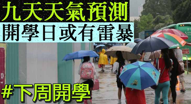 下周三開學日(9月1日)大致多雲,間中有驟雨,早上局部地區有雷暴,氣溫介乎27度至31度。下周四(2日)至周六(4日)部分時間有陽光,有幾陣驟雨,最高氣溫32度。建議大家開學日當天帶備雨具出門為佳。