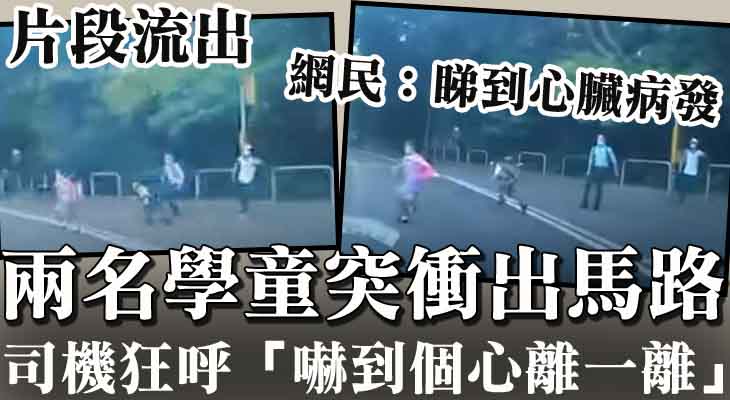 嚇得司機急煞停車,幸未將兩名學童撞倒,但司機猶有餘悸,狂呼「嚇到個心離一離」,事後更在網上上載當時車cam片段,提醒各家長過馬路時要「拖實小朋友」,以免累己累人。