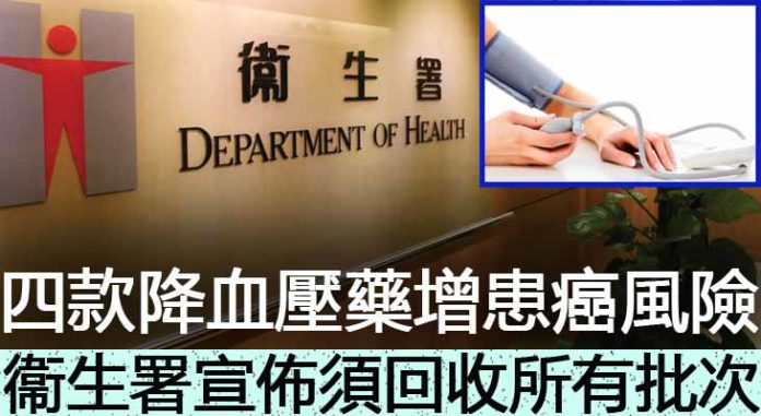 衞生署表示,同意持牌藥物批發商瑞士諾華製藥(香港)有限公司採取預防措施,從市面回收以下四款降血壓藥的所有批次,因為相關產品含有雜質。衞生署呼籲正在服用該藥的病人,應向醫護人員查詢。