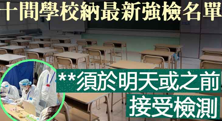 在10月19日至11月1日期間於沙田美林邨屋邨小學第一校舍東華三院蔡榮星小學就讀四年級的學生及曾面授該等指明級別學生的指明學校老師,須於11月3日或之前接受檢測。受檢人士若在10月30日至11月1日期間已進行檢測,會獲視為已遵從規定。