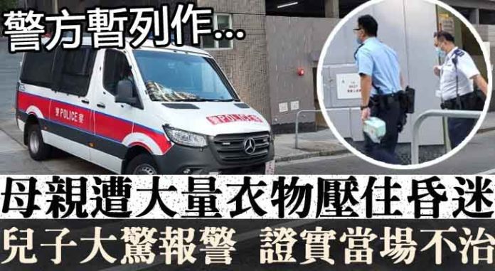 今日(19日)早上8時40分,北角雲景道50號富麗園B座一個單位內,一名59歲姓謝女子於單位房間內遭大量衣物壓著,昏迷不醒,其兒子發現立即報警。