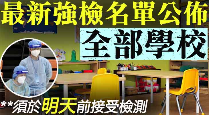 政府強制檢測公告刊憲,要求於指定期間曾身處以下學校者,須接受新冠病毒核酸檢測。政府指,由於以下學校爆發上呼吸道感染或流感樣疾病個案,而有關疾病病徵與新冠病毒相似,為謹慎起見,相關學校被納入強制檢測公告。已經完成接種新冠疫苗者會獲視為已遵從強檢公告的規定。