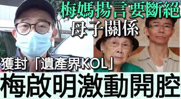 近日有媒體聲稱再聯絡上梅媽,當時主持人又指梅媽只是年紀大很多事都控制不來,因此令梅啟明自把自為,主持人指梅媽聲言若果梅啟明不放棄入稟控告,會跟他斷絕母子關係。