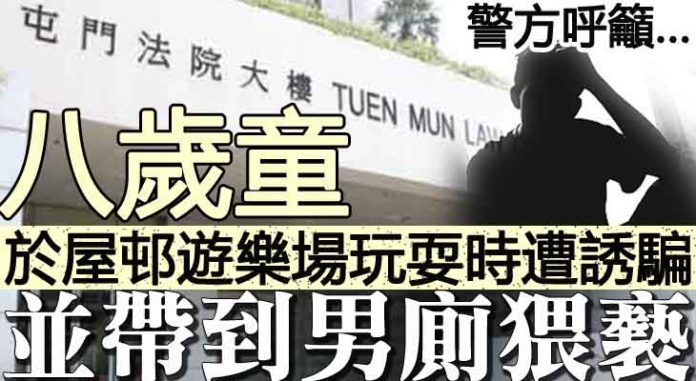 警方於周日(12日)晚上接獲一名8歲童的家人報案,稱該名男童於同日下午在屯門某一公共屋邨的遊樂場玩耍期間,被一名男子誘騙到附近商場餐廳用膳,及後帶往一商場男廁內作出猥褻侵犯行為。
