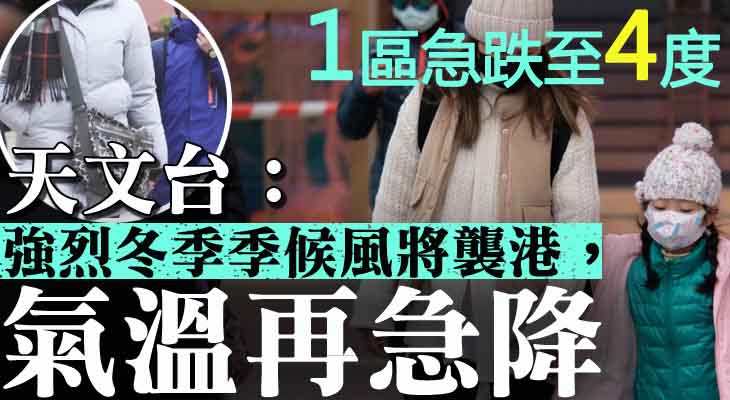 下周一(27日)一早上7時,市民外出上班就更加要注意保暖,打鼓嶺氣溫跌至4度,石崗、上水氣溫6度,大埔、沙田7度,其他地區介乎8至10度。