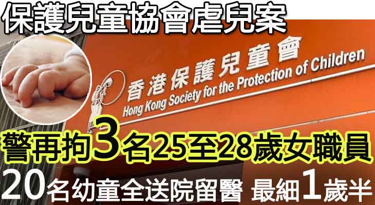香港保護兒童會轄下「童樂居」3名職員上周涉虐兒被捕,警方今派員再調查及翻查閉路電視片段,發現更多小朋友懷疑曾被虐打,將2名小朋友送院檢查,據悉年紀最小只得1歲半,警方於是再拘捕3名職員。