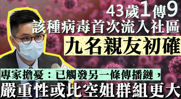 蕭教授續指,暫時不清楚BA.2的傳播性,但肯定已觸發另一條傳播鏈,直言情況令人擔心。他指,該名患者一個人傳染9名密切接觸者,若該9人在社區中再每人傳染9人,其嚴重性或較早前的空姐群組更大。